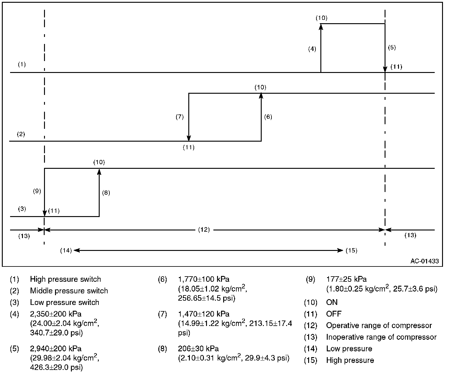 3. Start the air conditioner, and check the operating pressure of switch by turning the compressor (magnet clutch) to ON/OFF. Operation of each switch is as follows.