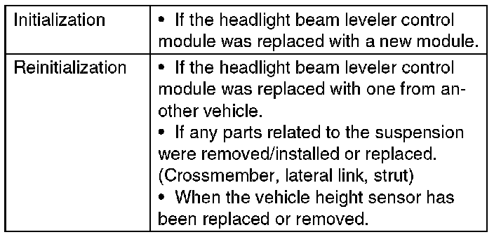 When parts related to the auto headlight beam leveler system are removed or replaced, perform the following procedures to initialize or reinitialize.