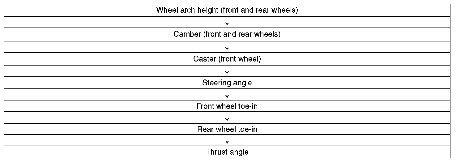 Check, adjust and measure the wheel alignment in accordance with the procedures indicated in the figure.
