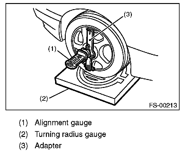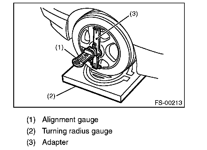1) Place the front wheel on the turning radius gauge. Make sure the ground contact surfaces of the front and rear wheels are at the same height.