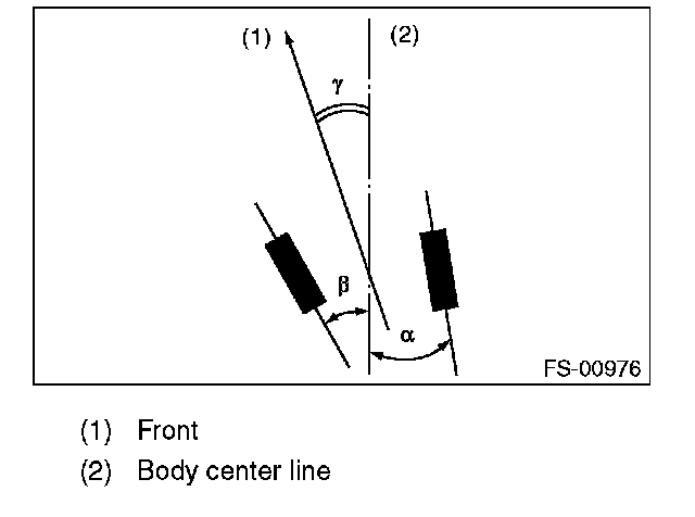 Thrust angle is a mean value of left and right wheel toe angles in relation to the vehicle body center line. Vehicle is driven straight in the thrust angle direction while slanting in the oblique direction depending on the degree of the mean thrust angle.