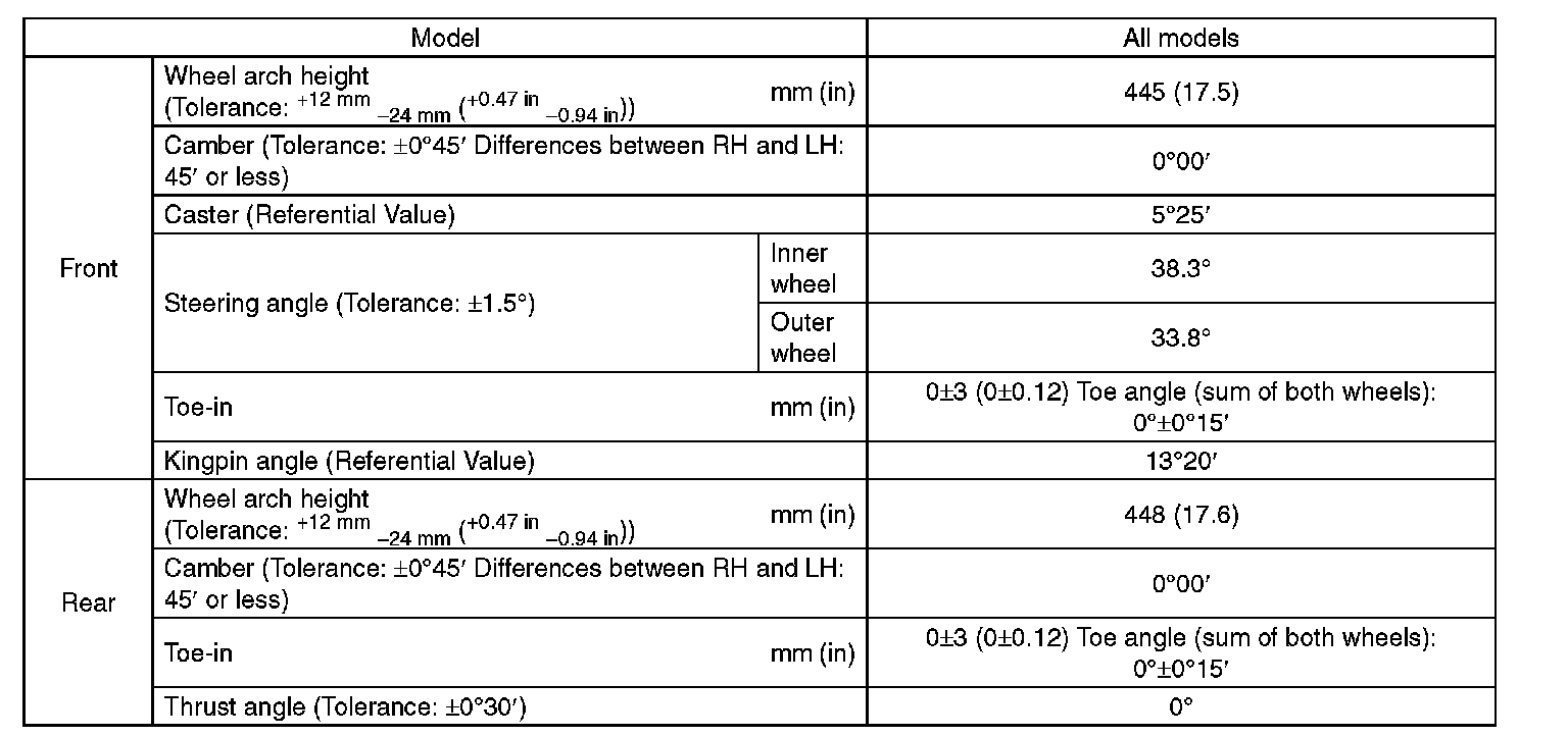 ^ Other items indicated in the specifications is not equipped with adjustment mechanisms. If other items exceed specifications, check the suspension parts and connections for deformation, and replace with new parts as required.