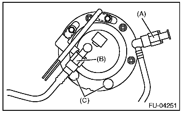 - Align protrusion (B) of the fuel sub level sensor to the cutout in the fuel sub level sensor upper plate.