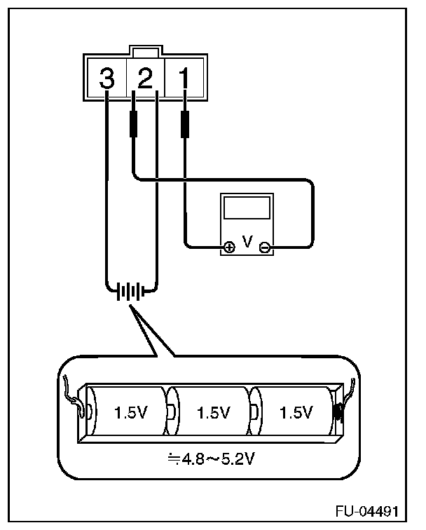 2. Connect dry-cell battery positive terminal to terminal No. 3 and dry-cell battery ground terminal to terminal No. 2, and circuit tester positive terminal to terminal No. 1 and circuit tester negative terminal to terminal No. 2.