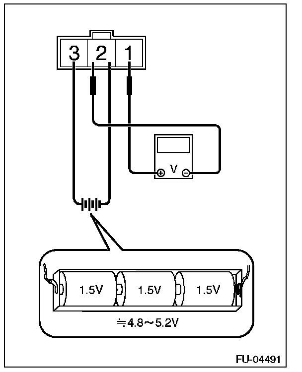 2. Connect dry-cell battery positive terminal to terminal No. 3 and dry-cell battery ground terminal to terminal No. 1, circuit tester positive terminal to terminal No. 2 and the circuit tester negative terminal to terminal No. 1.