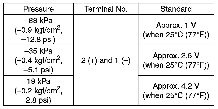 NOTE: When vacuum occurs at the pressure port of manifold absolute pressure sensor, the voltage will drop from the value as in step 3). When positive pressure occurs, on the other hand, the voltage will rise.