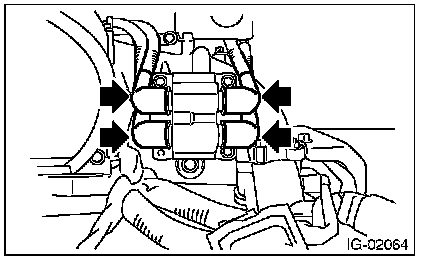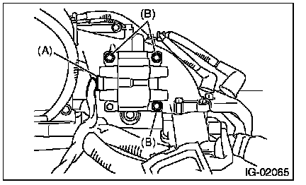 4. Remove the bolt (B) which secures the ignition coil and ignitor assembly to the intake manifold.