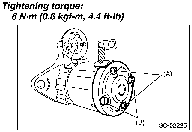 3. Remove screws (A) of the brush holder assembly, and through bolts (B) on both sides, and remove the starter cover assembly.