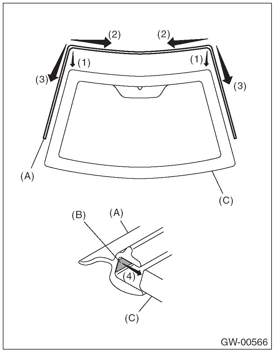 1. Align the molding (A) to the upper ends of the windshield glass (C).