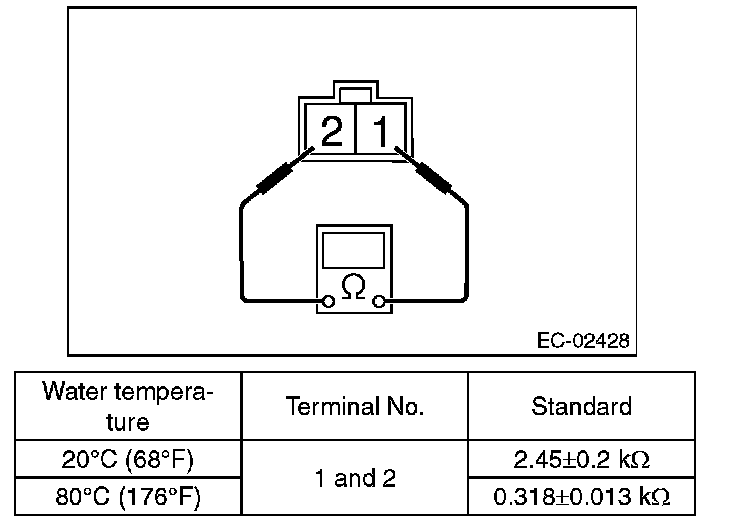 2. Raise water temperature gradually, measure the resistance between the engine coolant temperature sensor terminals when the temperature is 20 ° (68 °F) and 80 °C (176 °F).