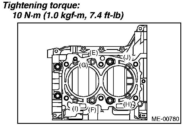 Tighten the 10 mm cylinder block connecting bolts on the RH side (E - J) in alphabetical order