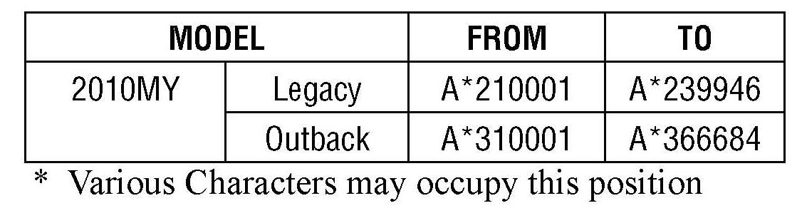 Subaru of America, Inc., has determined that certain 2010 Legacy and Outback models may have been produced with a plastic cover on the ABS (anti-lock brake system) electronic control unit that may have been cracked during the manufacturing process. The ABS electronic control unit is an integrated part of the brake hydraulic unit located in the engine compartment. If the cover is cracked and the electronic control unit is exposed to water, particularly from a high pressure source such as a garden hose or pressure washer, water can enter the unit and potentially cause a short circuit. If this were to happen, the unit will go into "failsafe" mode and the "S" warning light on the instrument panel will illuminate alerting the driver of a malfunction. When the warning light is on, the ABS function shuts down; however, the conventional brake system will continue to operate normally. In other words, even if the vehicle experiences this condition, the braking system will continue to function.