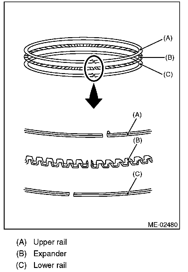 ^ Oil ring consists of the upper rail, expander and lower rail. When attaching the oil ring to the piston, pay attention to the direction of each rail.