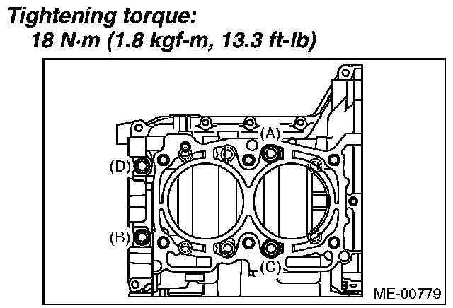 7) Tighten the LH side cylinder block connecting bolts (A - D) further in alphabetical order.