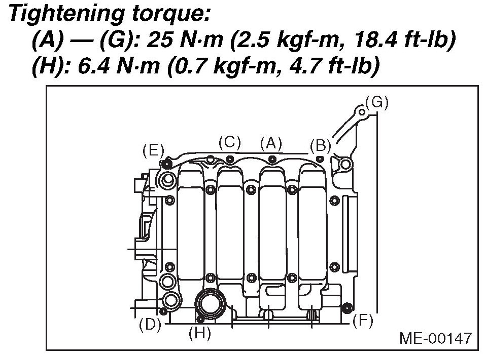 11) Tighten the 8 mm and 6 mm cylinder block connecting bolts on the LH side (A - H) in alphabetical order.