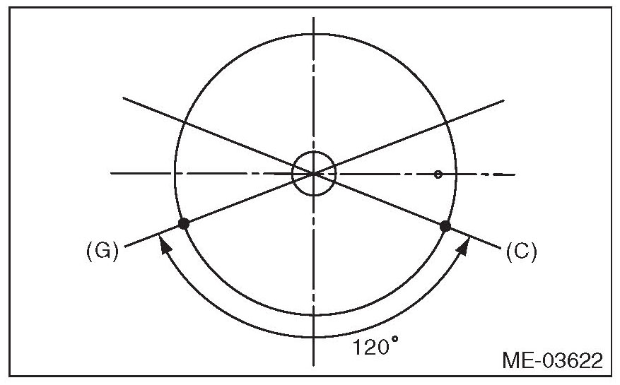 18) Set the lower rail gap at position (G), located 120 degrees clockwise from (C).