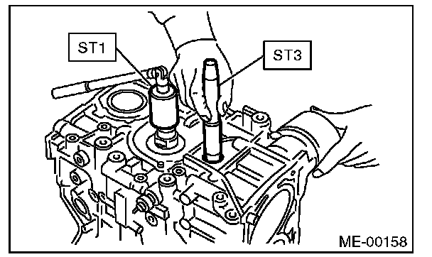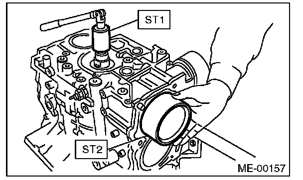 12) Apply a coat of engine oil to the oil seal periphery and install the rear oil seal using ST1 and ST2.