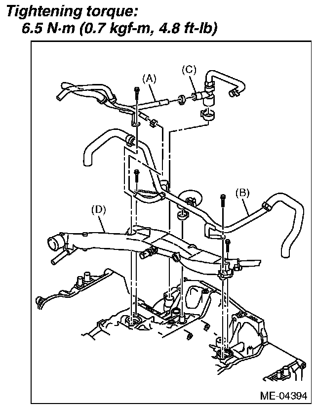 23) Install blow-by pipe assembly (A), blow-by pipe (B), PCV hose assembly (C) and water pipe assembly (D).