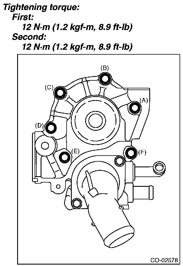 ^ When installing the water pump, tighten bolts in two stages in alphabetical order as shown in the figure.