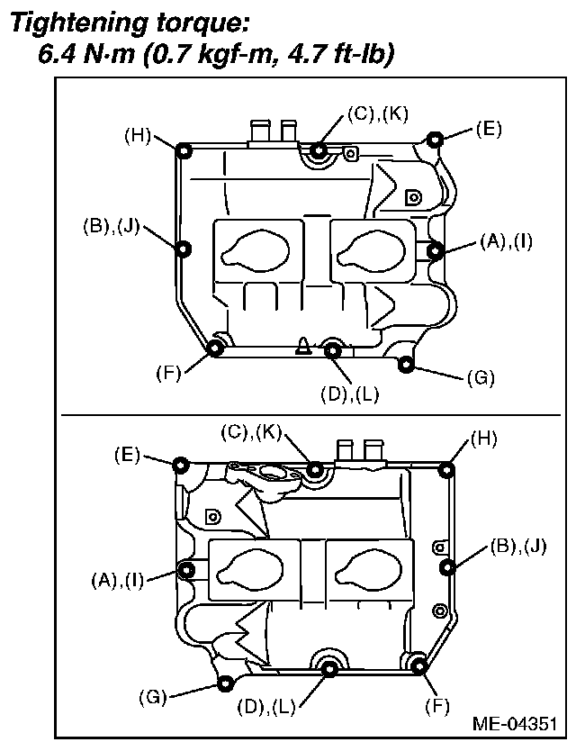 4) Temporarily tighten the rocker cover bolts in alphabetical order shown in the figure, and then tighten to specified torque in alphabetical order.
