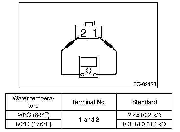 3. Raise water temperature gradually, measure the resistance between the engine coolant temperature sensor terminals when the temperature is 20 °C (68 °F) and 80 °C (176 °F).
