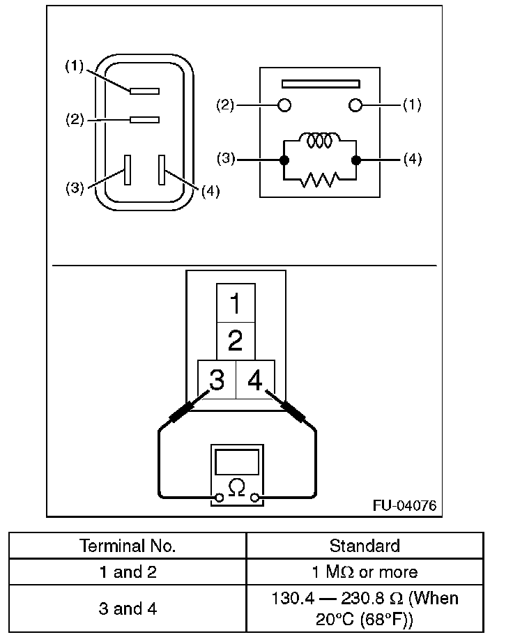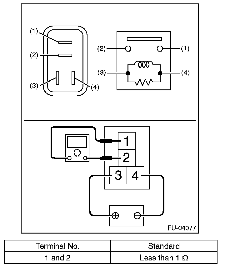3. Connect battery positive terminal to terminal No. 3 and battery ground terminal to terminal No. 4, and measure the resistance between the main relay terminals.