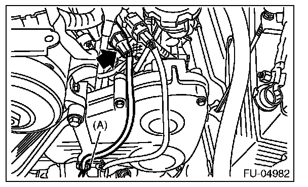 3. Disconnect the connector from the front oxygen (A/F) sensor, and remove the clip (A) holding the front oxygen (A/F) sensor harness.