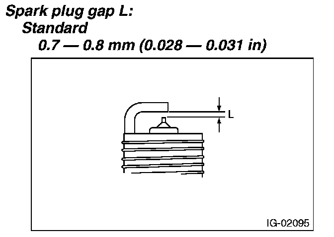 3. Using a nylon brush, etc., clean and remove the carbon or oxide deposits from the spark plug. If deposits are too stubborn, replace the spark plugs. After cleaning the spark plugs, check the spark plug gap "L" using a gap gauge. If it is not within the standard, replace the spark plug.