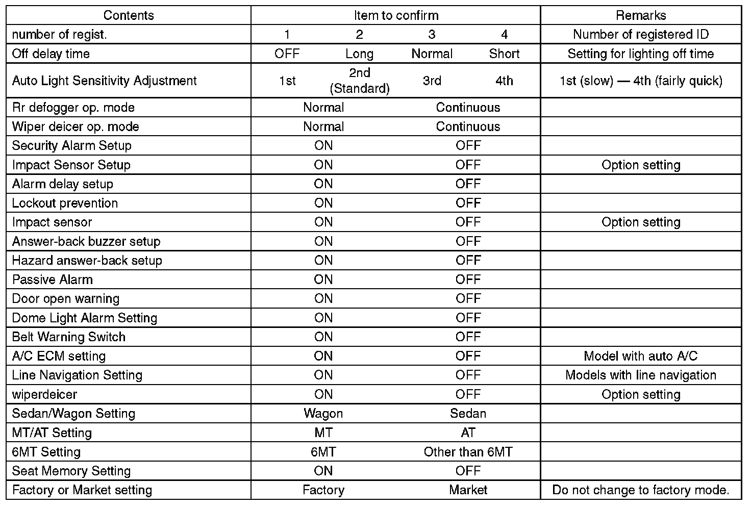 - Be sure not to change Factory or Market setting except when installing a new body integrated unit.