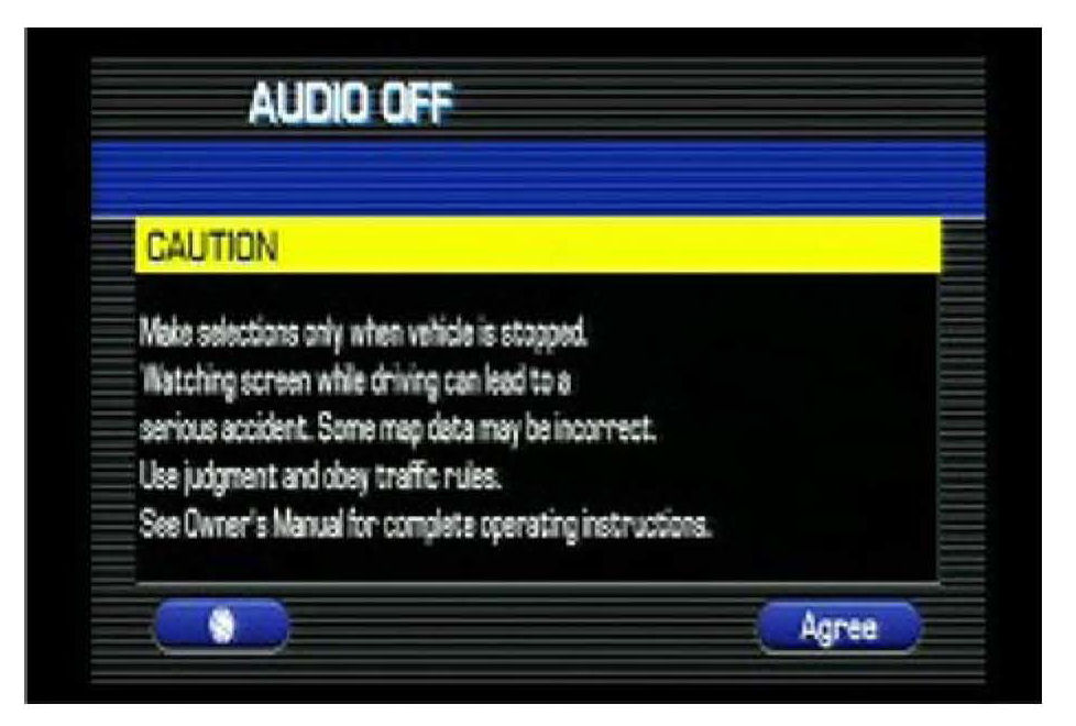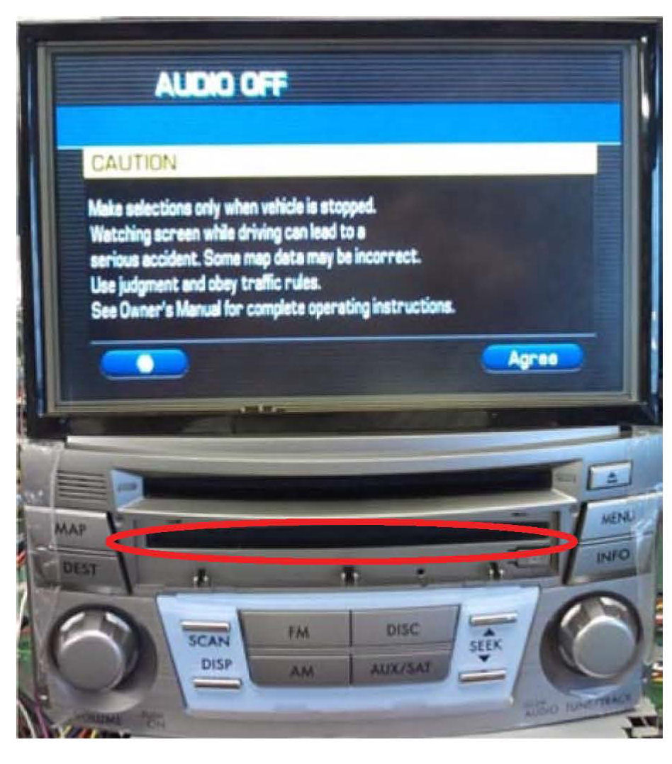 7) After the Opening screen, the Start-up CAUTION screen will be displayed. Touch the "Agree" soft-key. The CAUTION screen below will then be displayed. Impreza and Forester only: Press the TILT hard-key. The TILT/EJECT screen will be displayed.