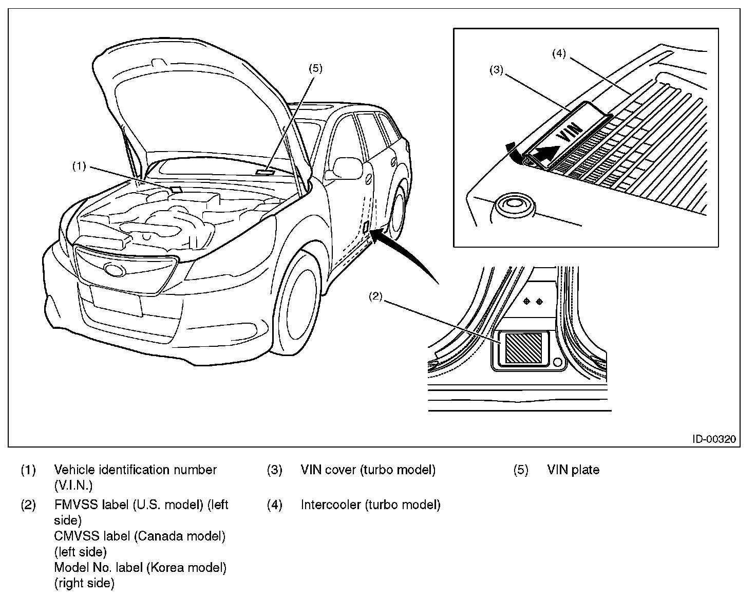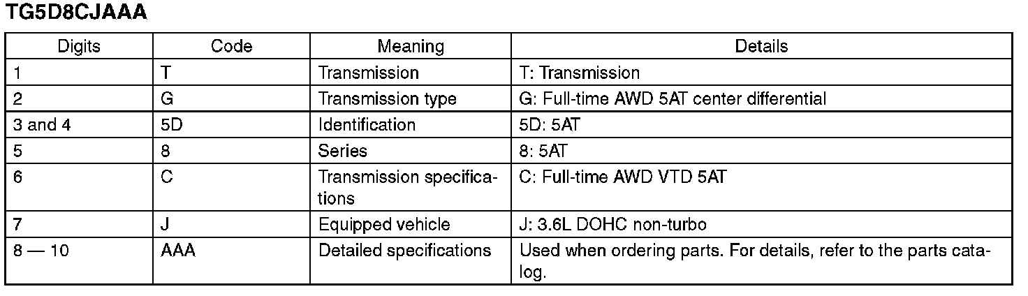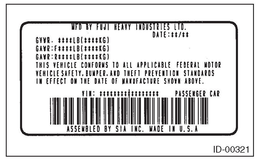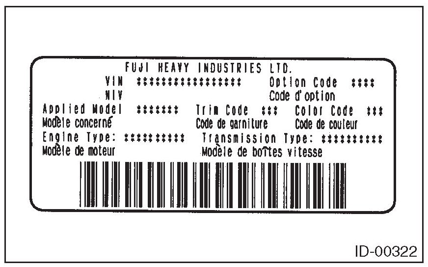 The model number plate indicates applied model, option code, trim code, engine type, transmission type and the exterior color code. This information is helpful when placing orders for parts.