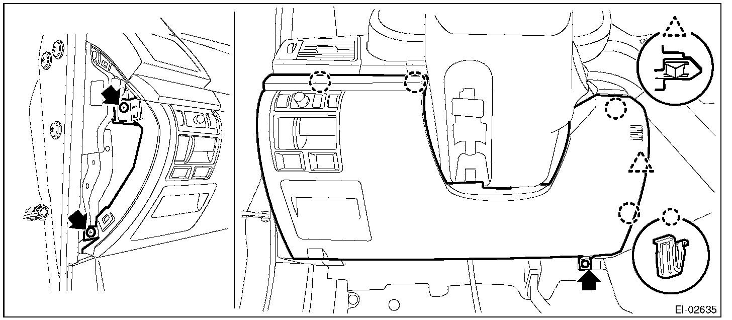 3. Remove the screws and clips and release the claws, and remove the instrument panel lower cover while disconnecting the harness connectors.