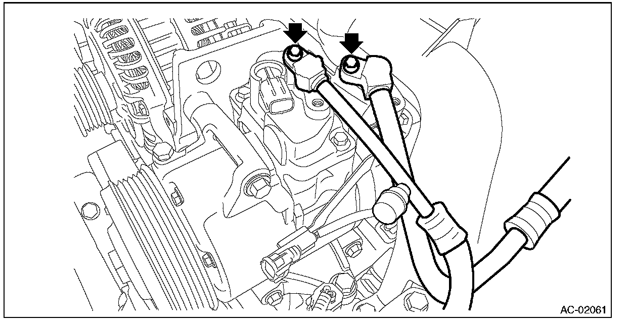 - If the engine may have been started with no refrigerant charge, check for any diagnosis code (DTC) using Subaru Select Monitor. If the code B1644 (Refrigerant not sealed drive error) is output, replace the compressor.