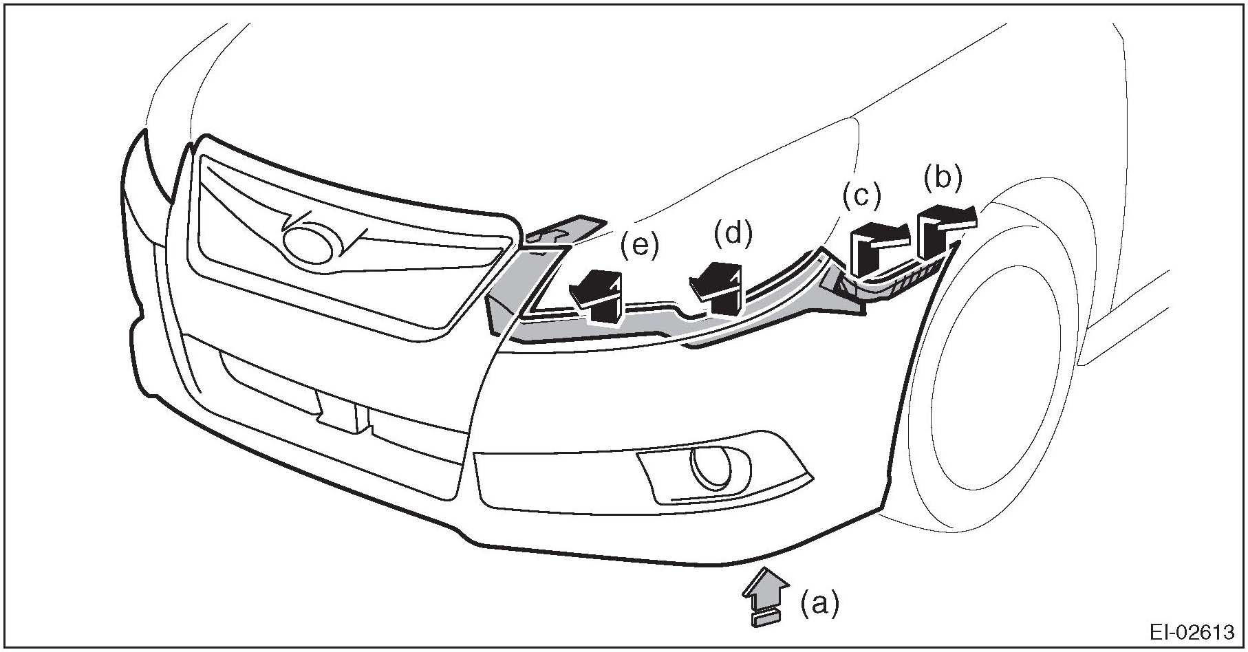 NOTE: While pushing upward with the underside (a) of the fog light, remove (b) to (e) in order. Detach the opposite side in the same manner.