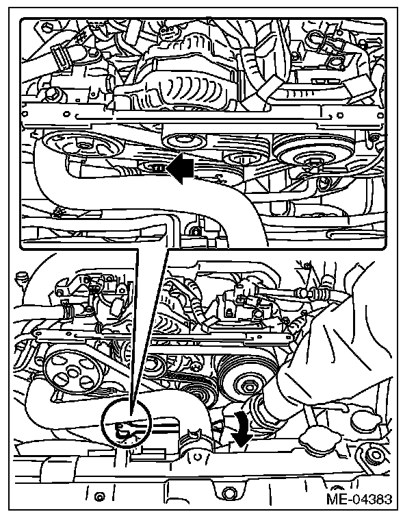2) Remove the bolt securing the V-belt tensioner assembly to the power steering pump bracket, and remove the V-belt tensioner assembly.