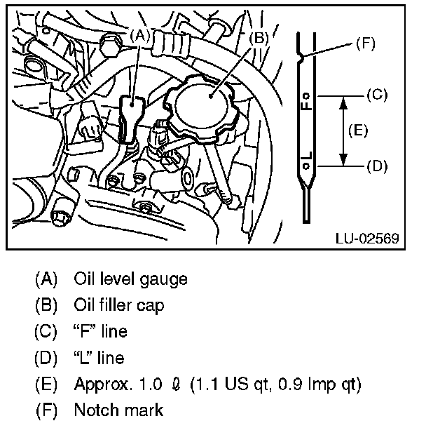 11) After stopping the engine, recheck the oil level. If necessary, add engine oil up to the "F" line on oil level gauge.