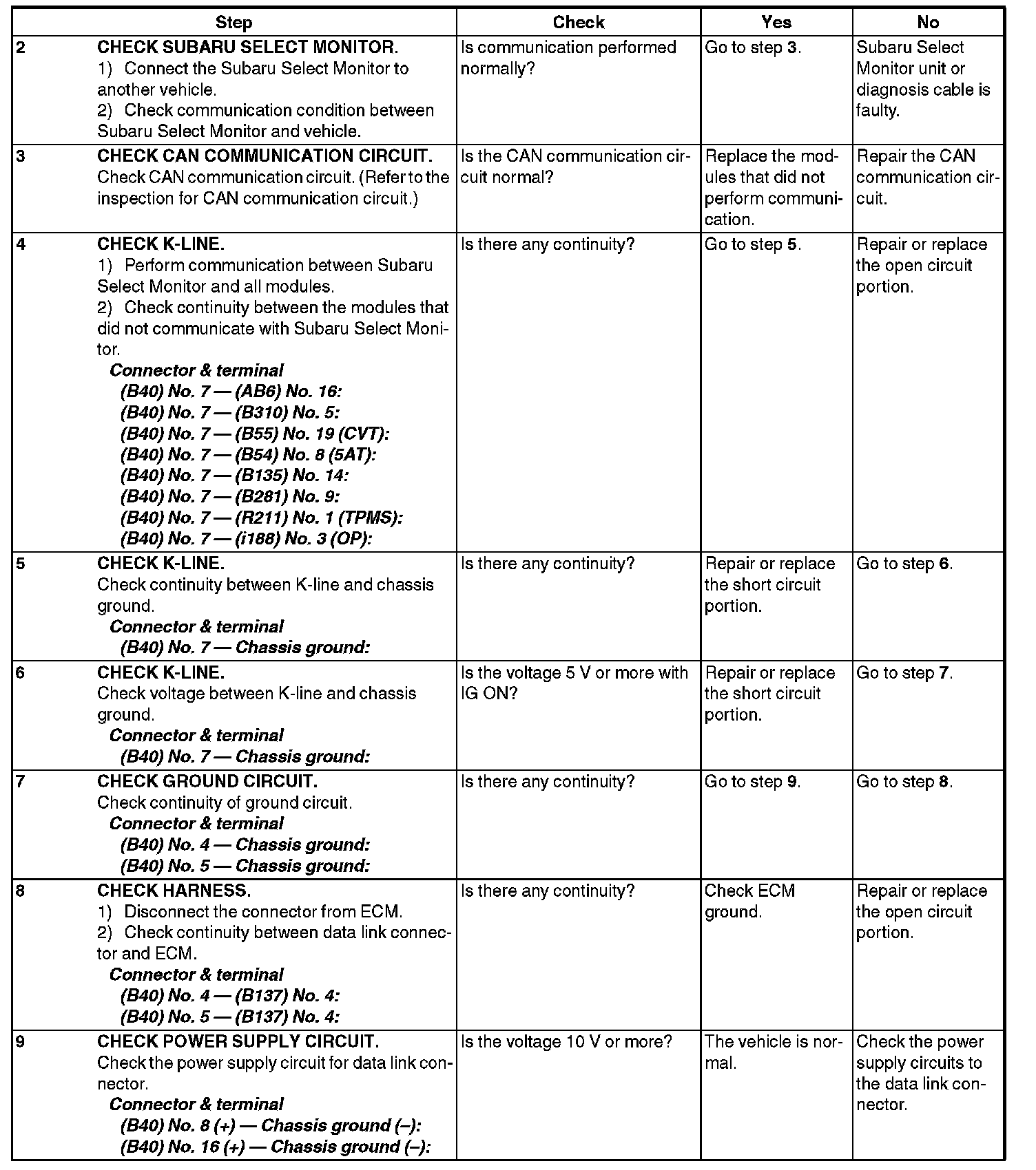 Subaru Select Monitor communication line (K-line) is open or shorted.