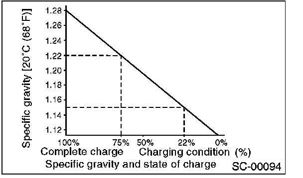 2. Measuring the specific gravity of the electrolyte in the battery will disclose the state of charge of the battery. The relation between specific gravity and state of charge is as shown in the figure.