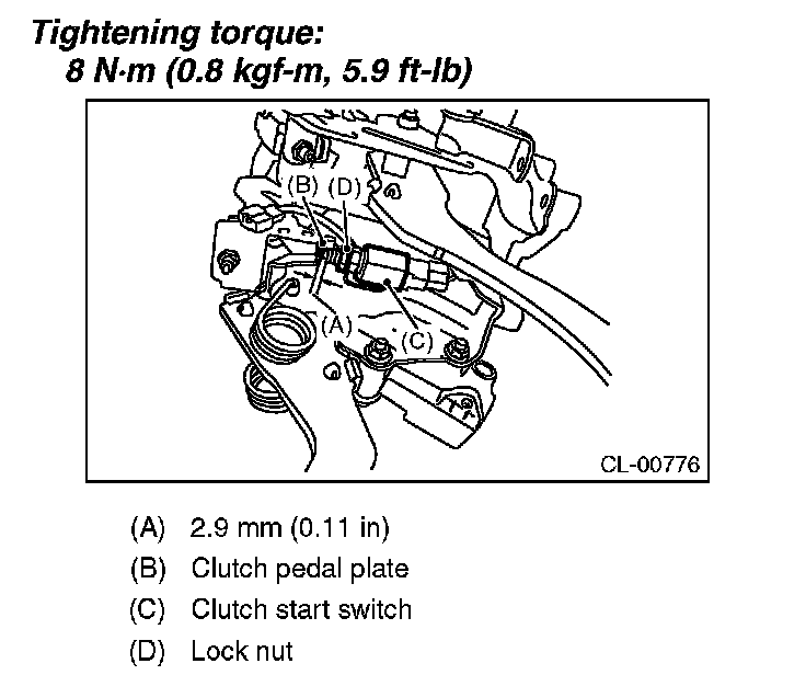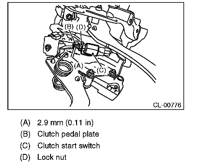 2) Install so that gap (A) of the clutch pedal plate and clutch start switch is 2.9 mm (0.11 in), and tighten the lock nut.