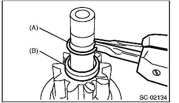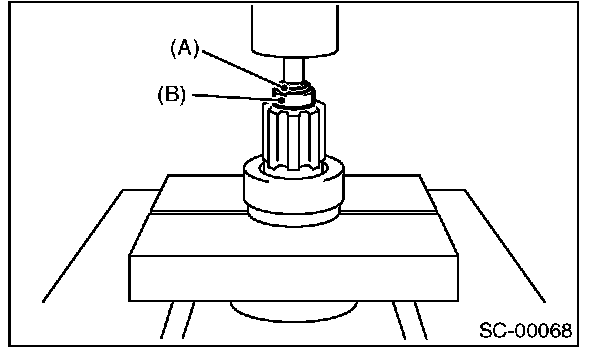 4. Using a press, pressure fit stopper (B) into snap ring (A).