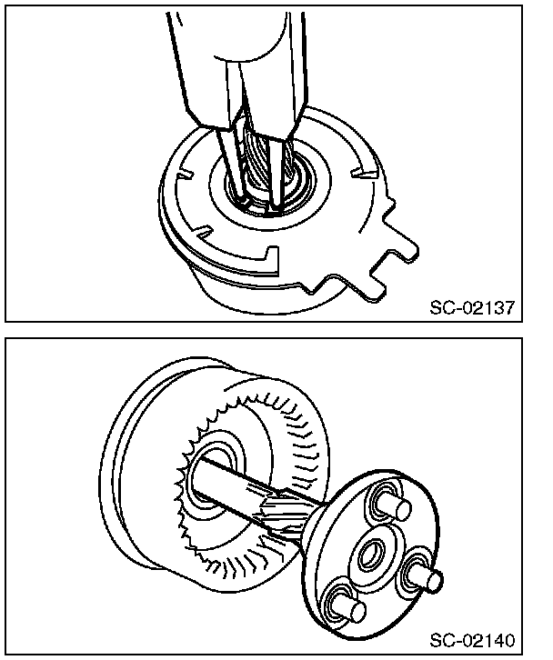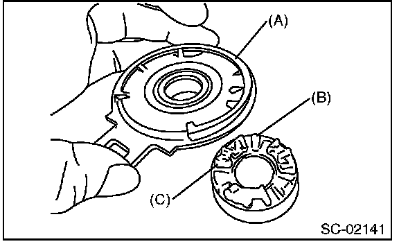 4. Separate shock absorber bearing (A) from internal gear (B), and remove shock absorber (C).