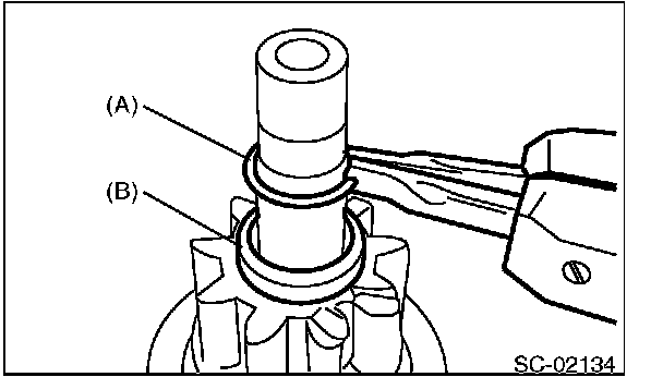3. Install stopper (B) to the shaft, then install snap ring (A).