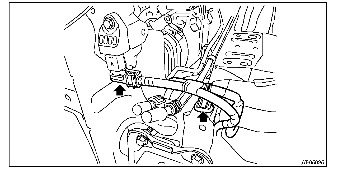 15) Remove the front sub sensor harness connector and front harness clip from the vehicle, and route them under the CVTF cooler pipe assembly. (OUTBACK model)