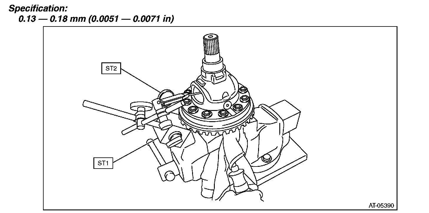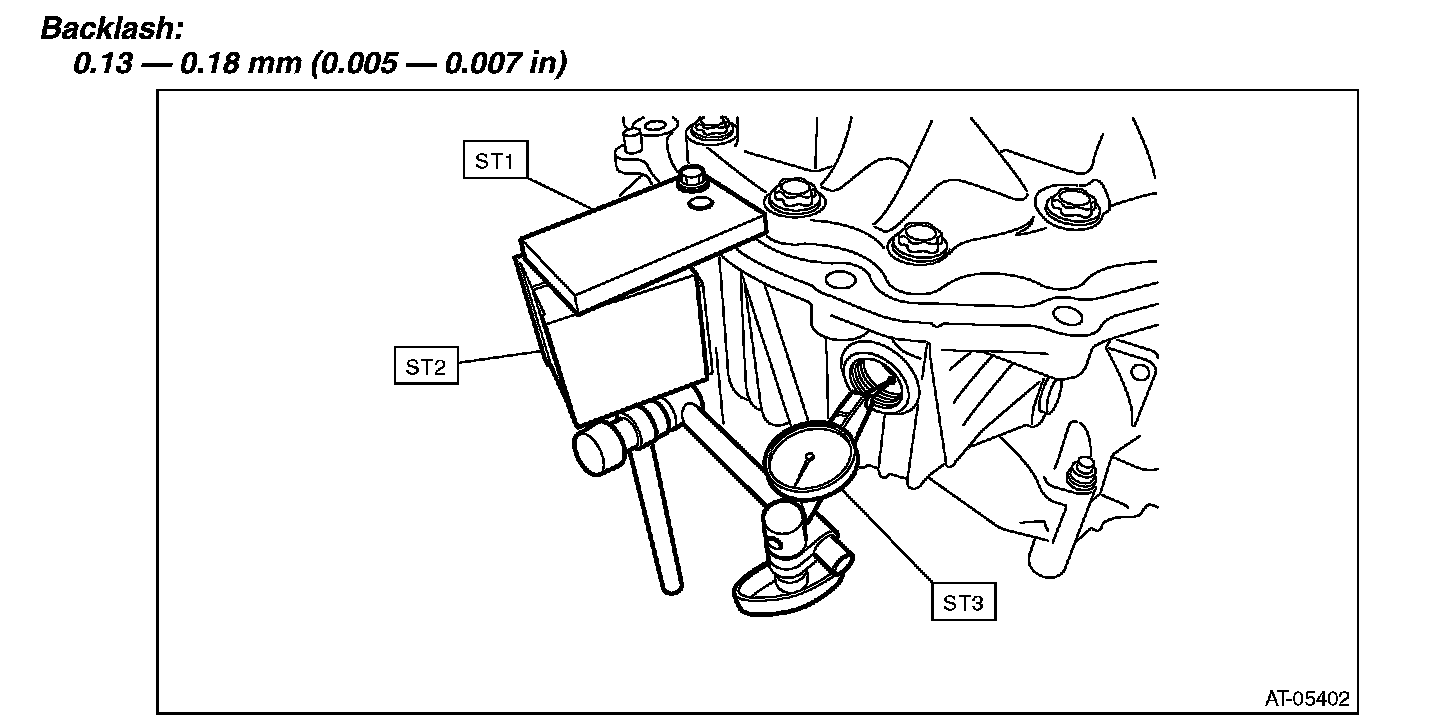 2) Measure the gear backlash using ST1 and ST2, and then insert the ST2 through the window of differential case.