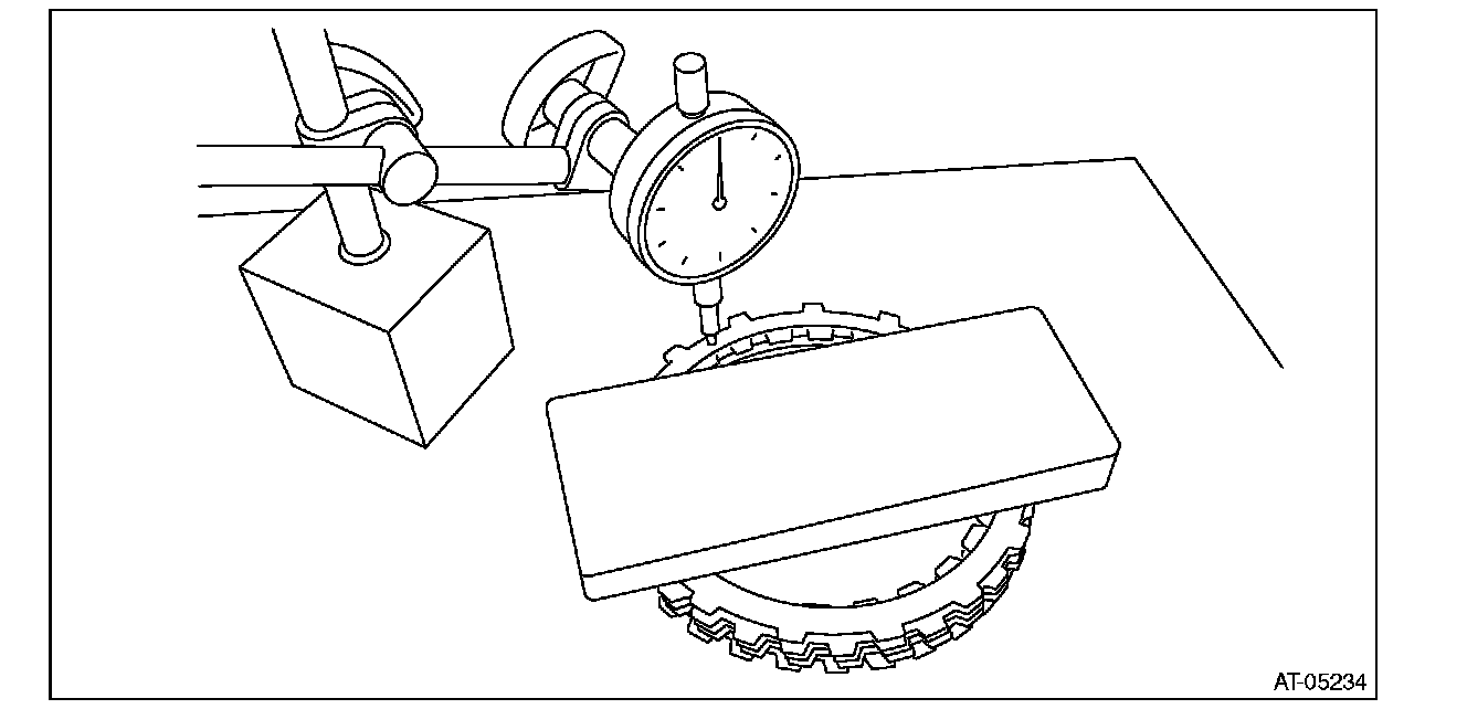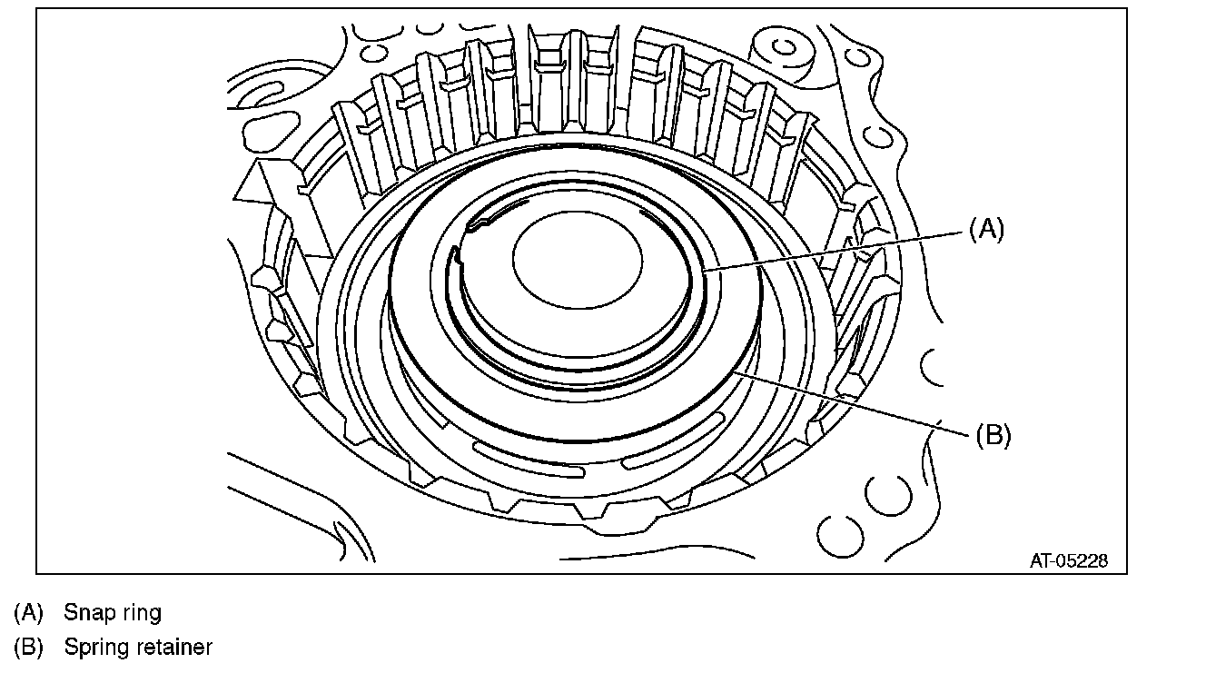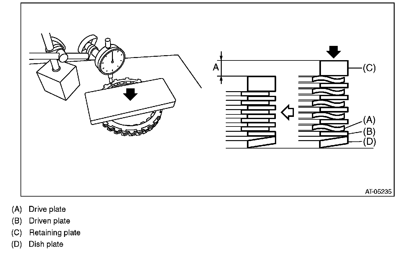 ^ Make sure the clearance between retaining plate and snap ring of reverse brake is within the limit. If it exceeds the limit, replace with a new drive plate and select and adjust the retaining plate within the initial standard value.