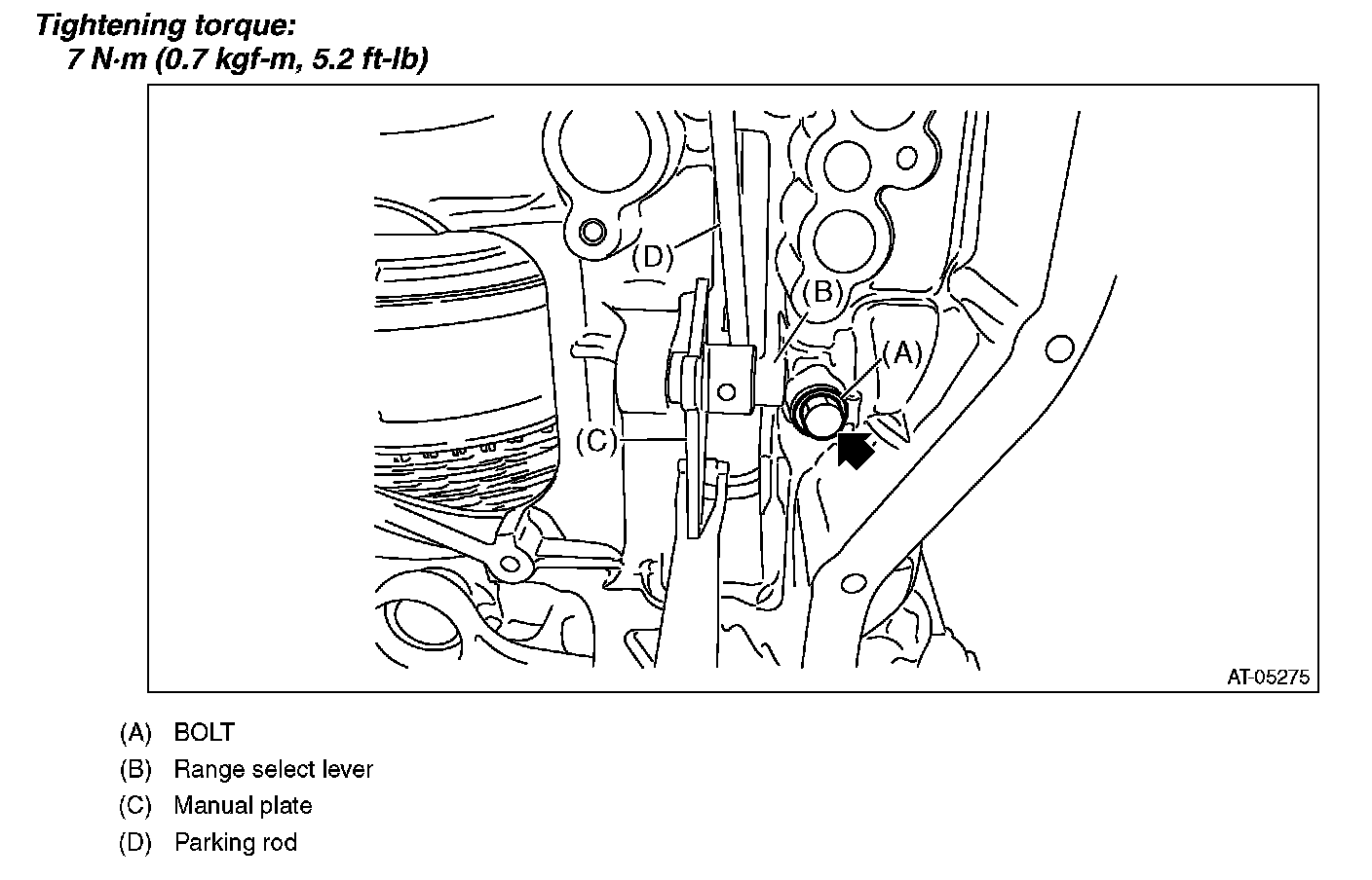 2) Install the manual plate, parking rod, range select lever and bolt.