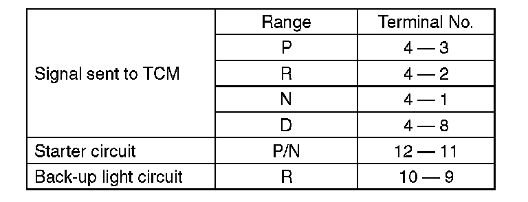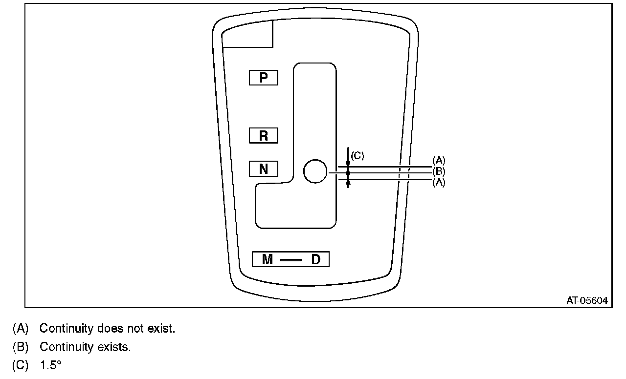 4) Check that there is continuity at equal points when the select lever is tilted 1.5° in both directions from the "N" range. If there is continuity in only one direction or in other points, adjust the inhibitor switch.