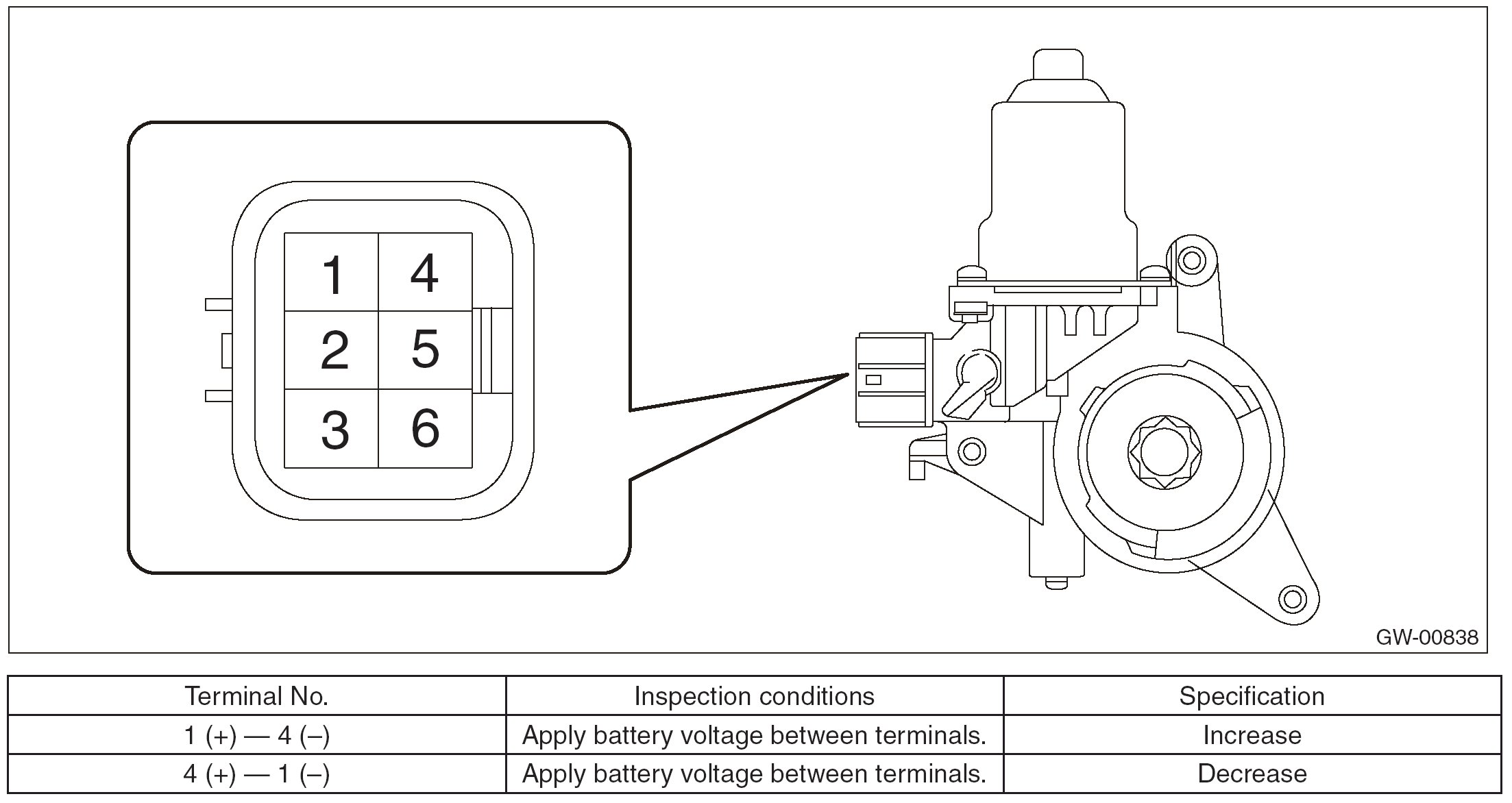 2. Apply battery voltage between the motor connector terminals and check the motor operation.