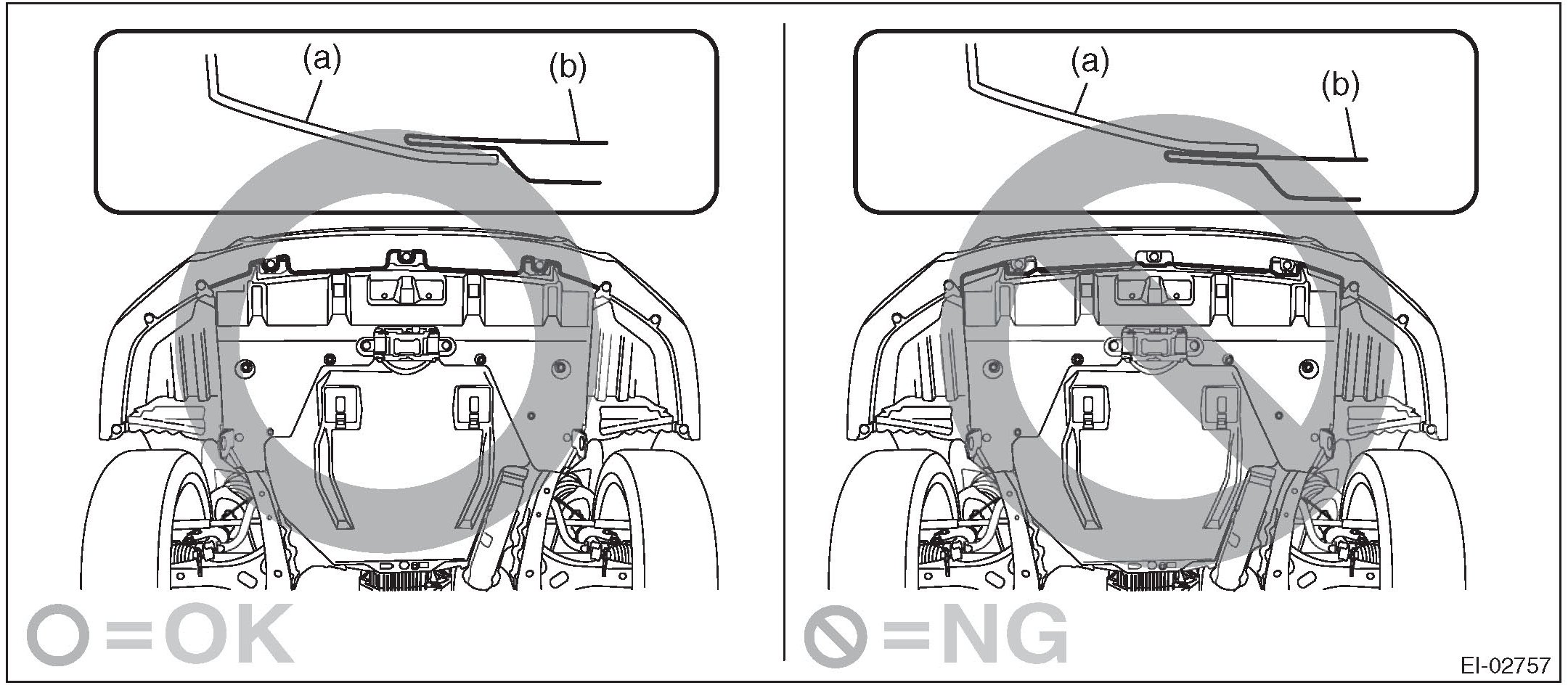 CAUTION: Install the bumper face so that the under cover front end (b) comes inside the front bumper face (a).