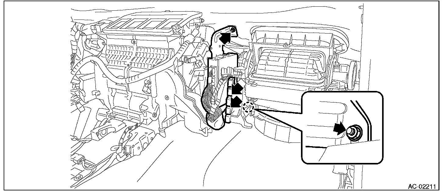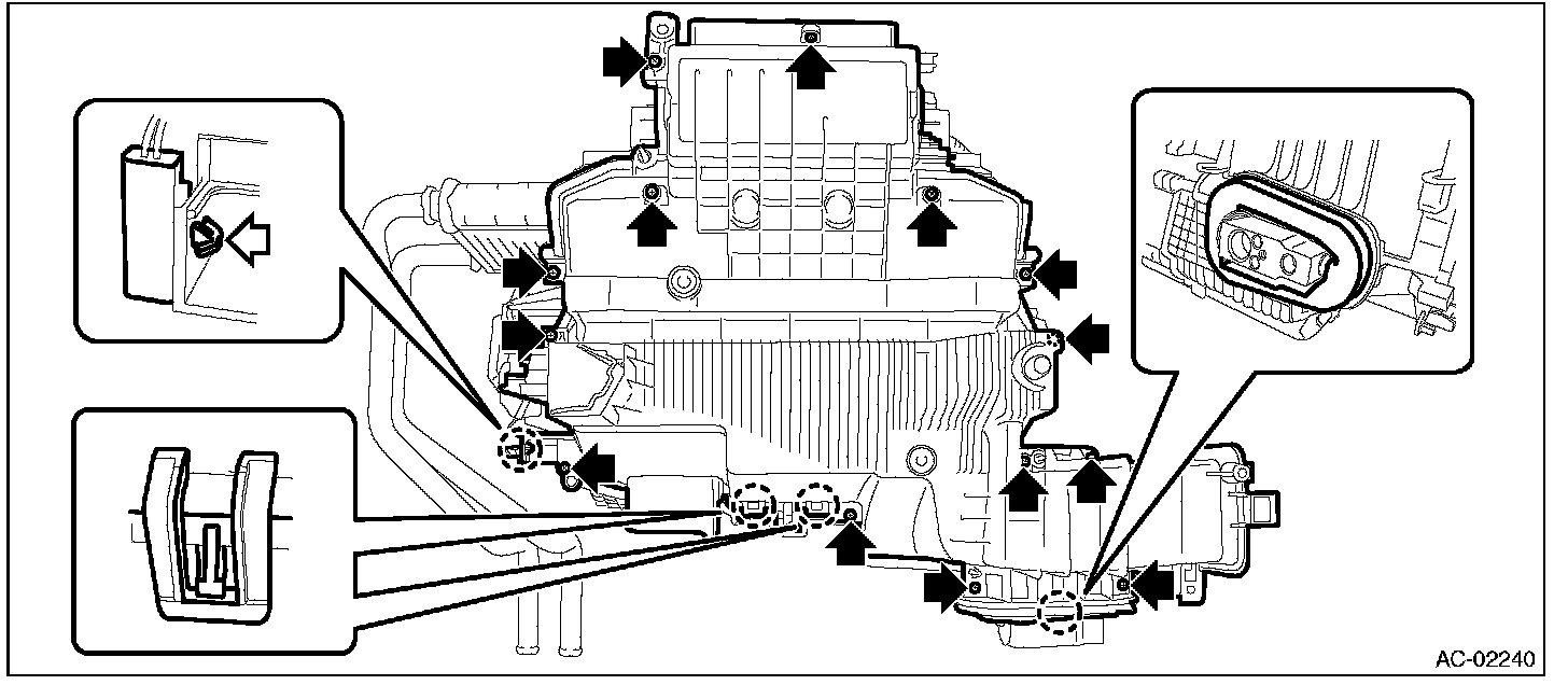 4. Remove the connector and bolts, and remove the expansion valve and AC pipes from the evaporator.